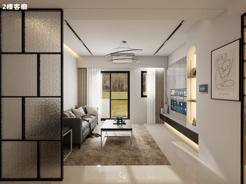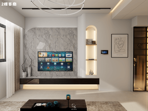 2.二樓客廳部分電視牆使用大板磚,大板磚具備耐刮磨,輕薄,花色穩定且易保養等優點,常被用於客廳電視牆、廚房中島、浴室牆面及檯面,能模擬天然石材或純色效果,相較於大理石性價比更高