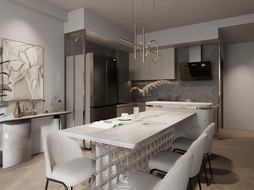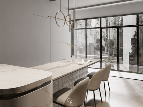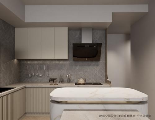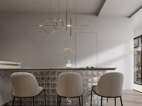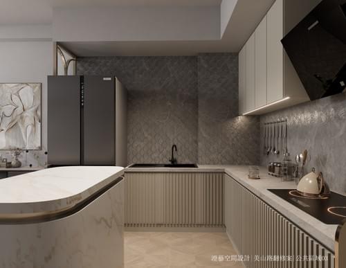 2.空間中運用異材質拼接與精緻感的材質,例如大理石紋的中島與壁面、金屬質感的燈具與收納架邊框,以及帶有幾何紋理的藝術玻璃隔屏。